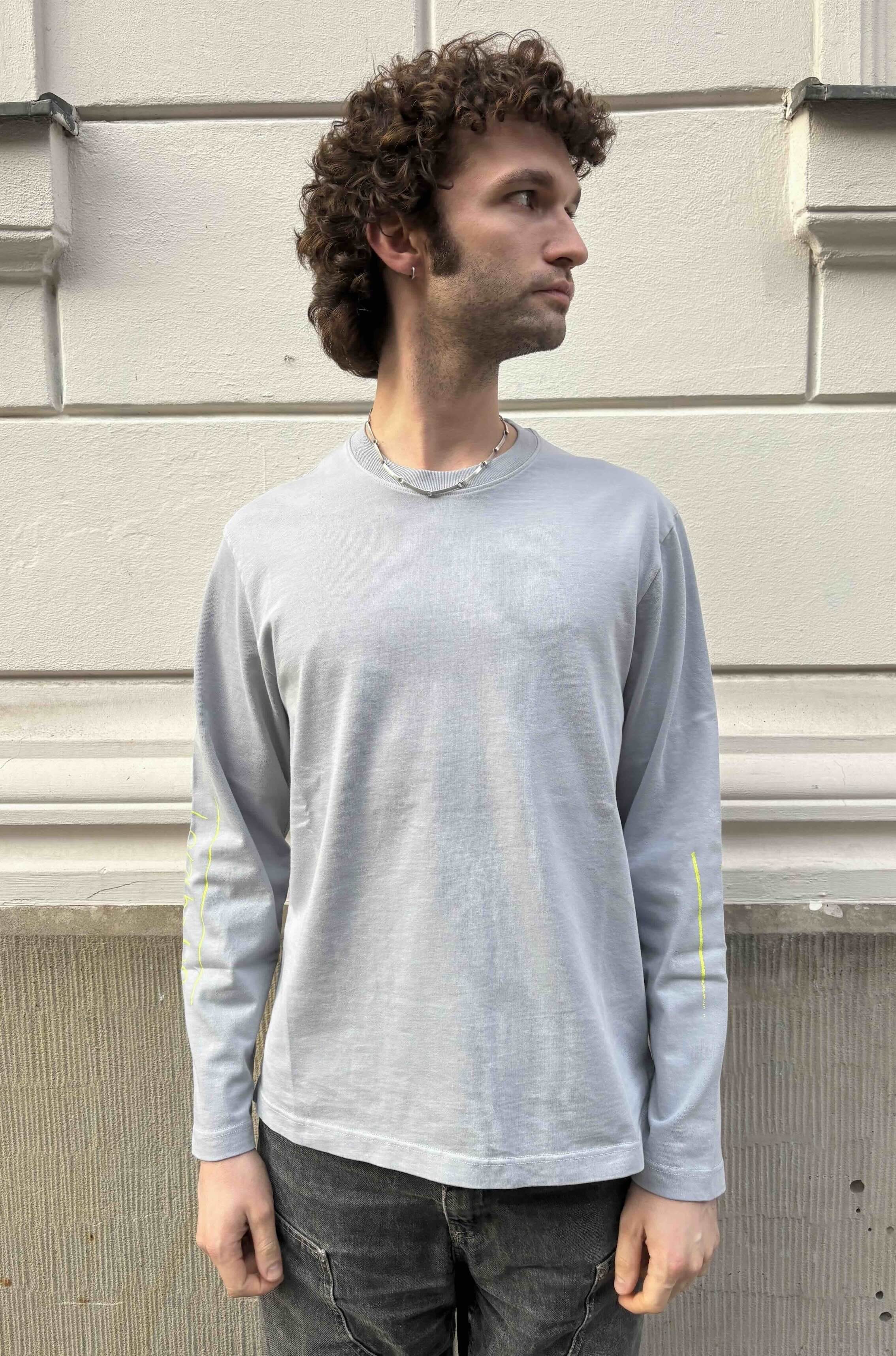 Klassisch geschnittenes Langarmshirt in kühlem Grau mit gelbem „KW“- und „URGENT“-Print.